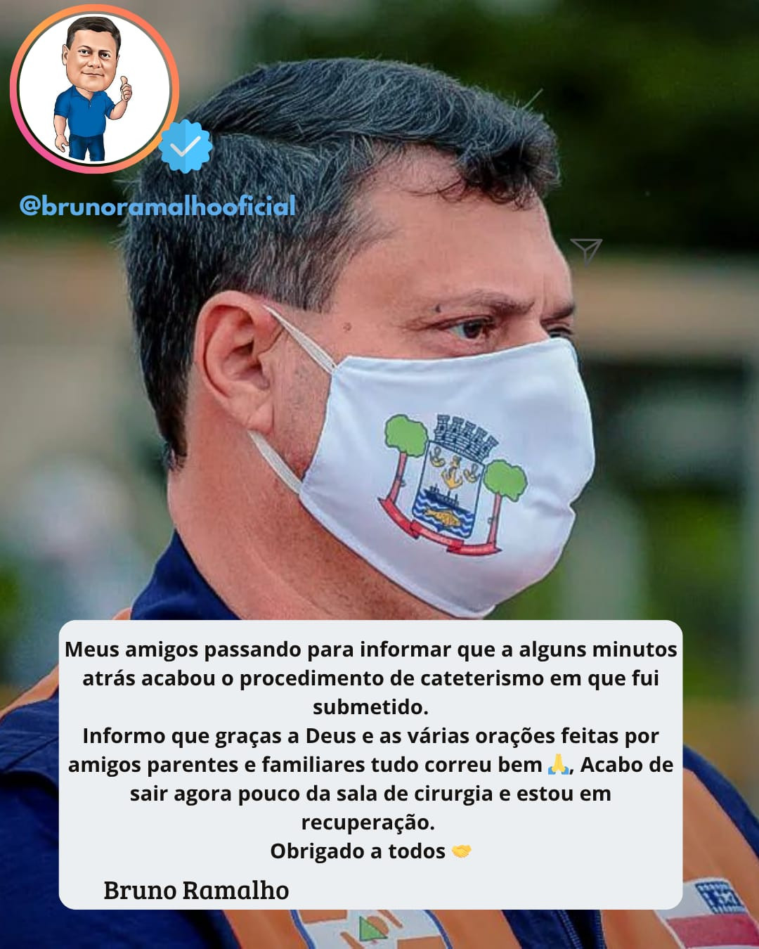 O ex-prefeito de **Carauari>, Bruno Ramalho, passou por um procedimento de cateterismo e está em recuperação. A informação foi divulgada por meio de mensagem compartilhada por pessoas próximas, informando que o procedimento foi concluído com sucesso e que ele já havia saído da sala de cirurgia, apresentando boa evolução no pós-operatório.