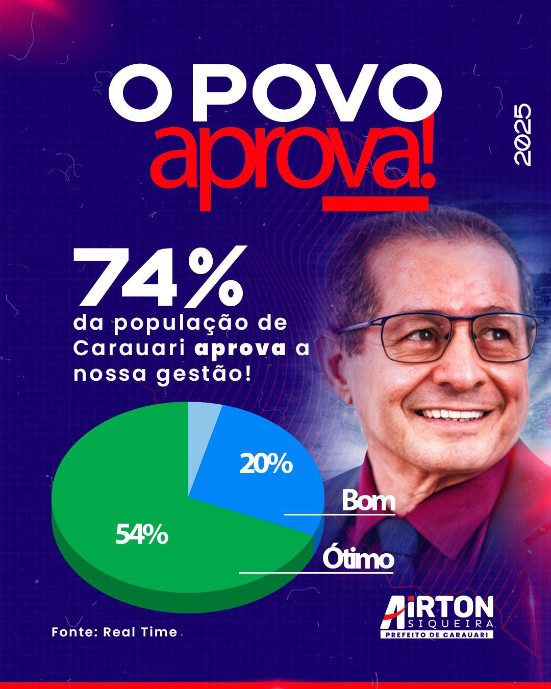 Uma pesquisa divulgada pelo Portal Real Times 1 revelou que 74% da população de Carauari aprova a gestão do prefeito Airton Siqueira. O levantamento reforça a confiança da população no trabalho que vem sendo desenvolvido pela administração municipal.